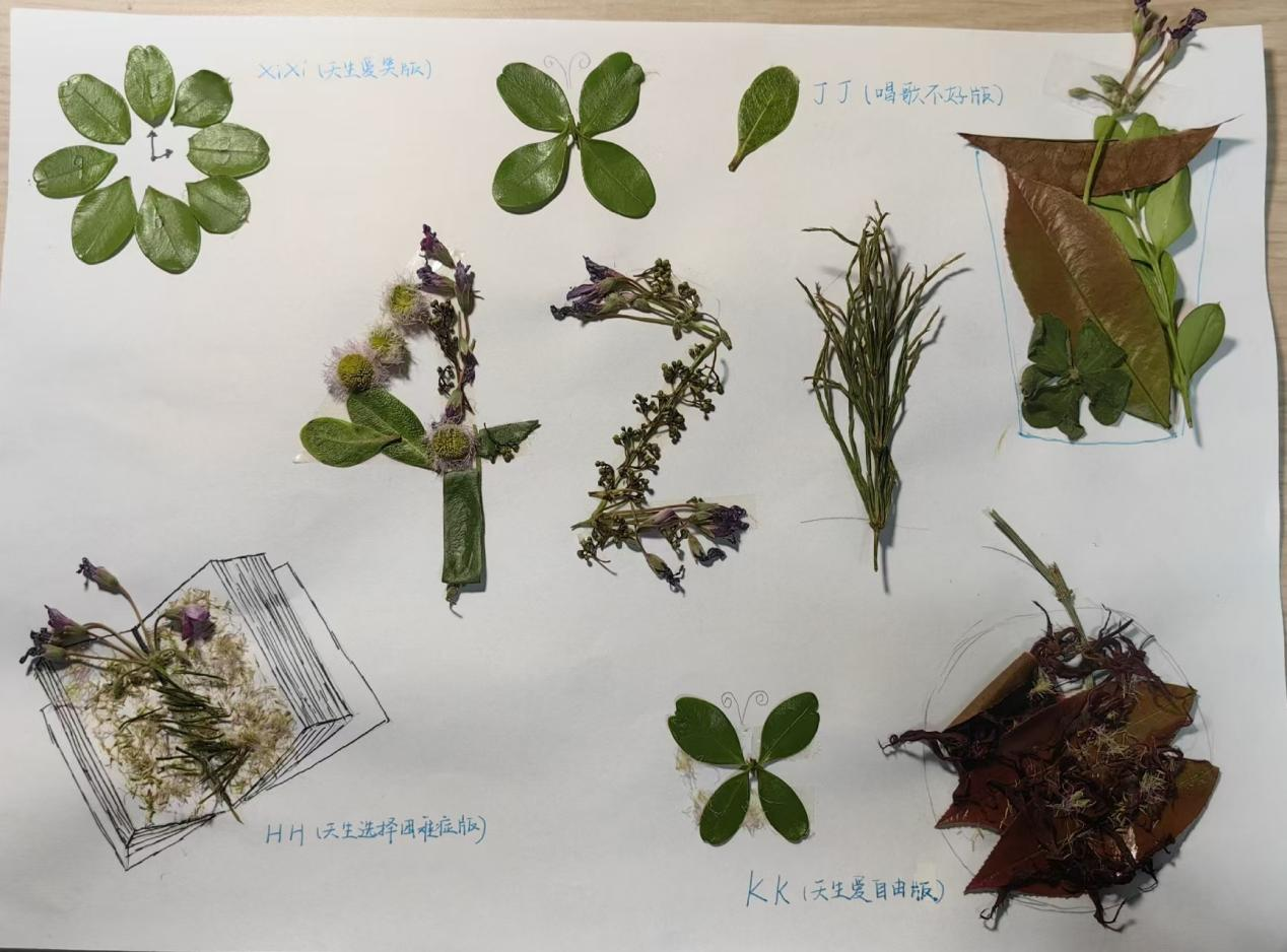 这是一幅独具创意的宿舍主题植物拼贴画,画面用各类植物巧妙组合成人物形象,充满巧思。不同形状、颜色的叶片化作人物的身体、头发等部分,搭配缤纷小花,宛如身着彩衣。叶片上标注的数字,或许是宿舍编号或特殊日期。下方名字代表宿舍成员,以植物拼贴的方式呈现,既展现了创作者对植物的敏锐观察,也体现出舍友间的独特情谊 。它以自然之物为笔,绘出宿舍生活的温馨与美好,是自然与创意、情谊融合的独特作品。