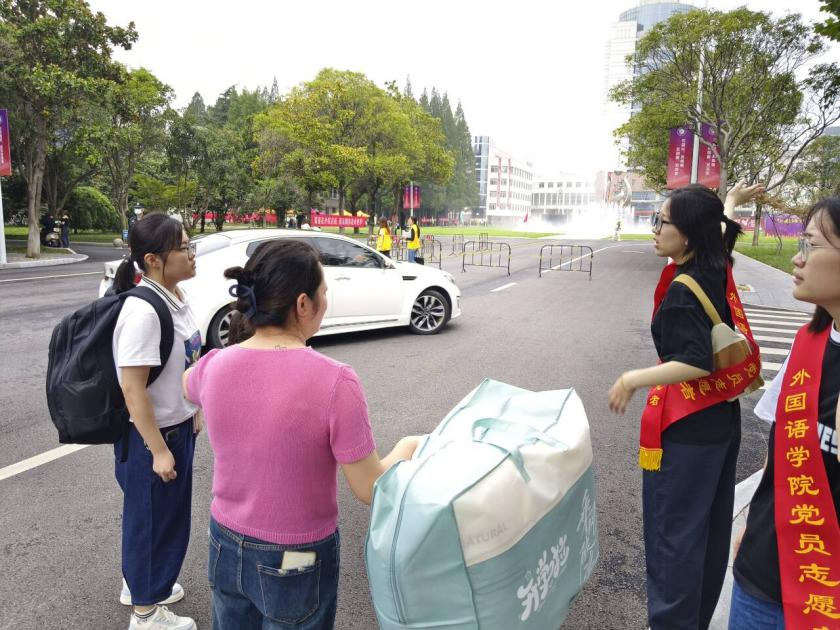 党员志愿者们身穿志愿马甲,面带微笑热情引导新生们找到大部队。迎新处的细心接待缓解了新生们初到集体的拘谨。句句叮咛,谆谆嘱咐,孩子永远是家长心中的小孩。最后再为你整理好衣领。从此,广阔天地任君翱翔。