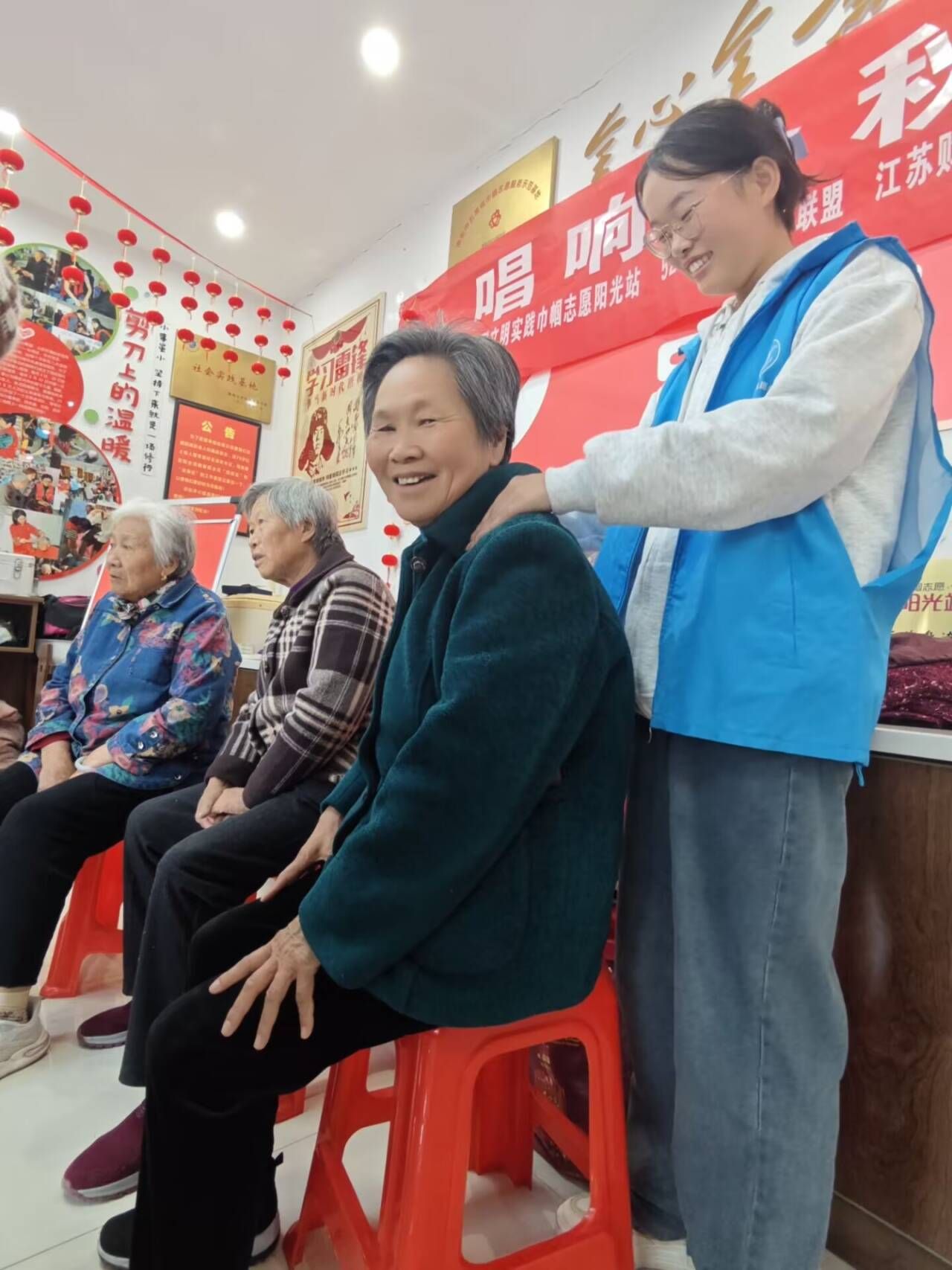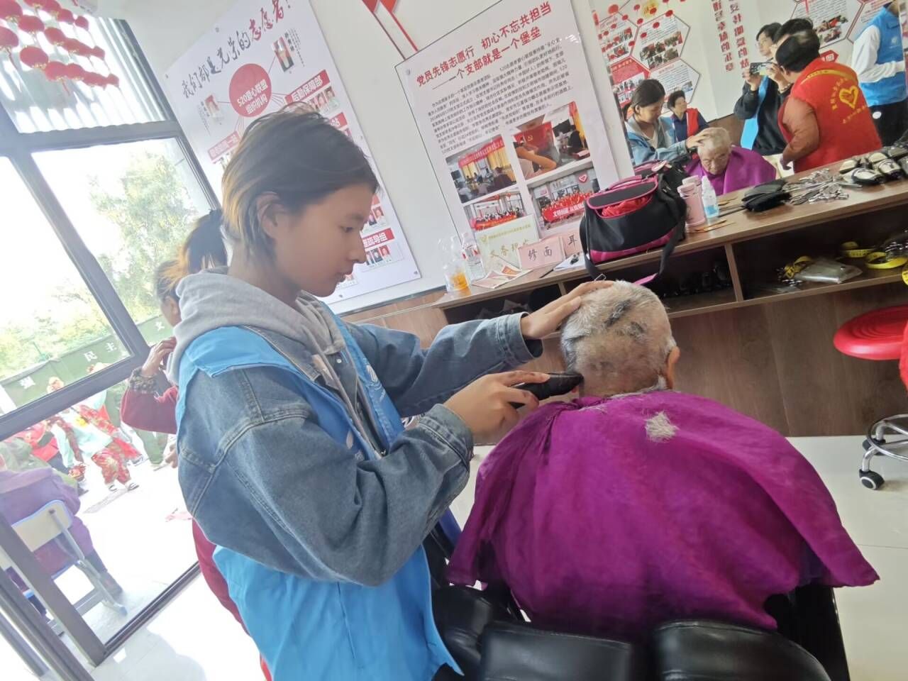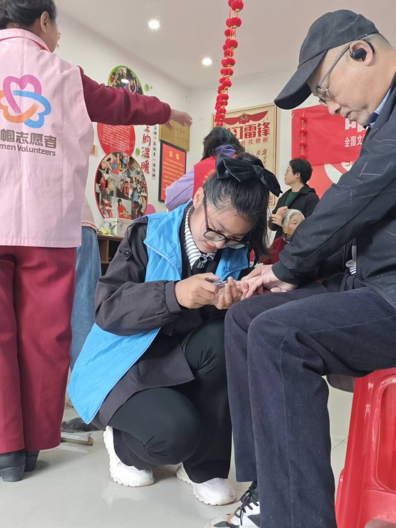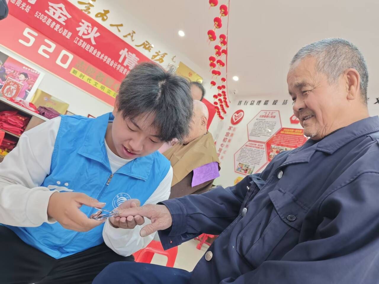 在活动现场,志愿者们各司其职,尽心尽力地为老人们提供服务。部分志愿者负责为老人修剪头发,细致入微地整理他们的发型;部分志愿者则专注于为老人修剪指甲,小心翼翼地处理每一个细节;其余部分志愿者则为老人提供捶背服务,帮助老人们缓解疲劳,放松身心。在志愿者的真情付出和不懈努力下,老人们脸上洋溢着幸福的笑容,并对志愿者们表示由衷的感激和称赞。这种互动不仅让志愿者们近距离体会到了志愿服务的魅力,更激发了他们继续参与志愿活动的热情,让他们深刻体会到助人为乐的真正意义。